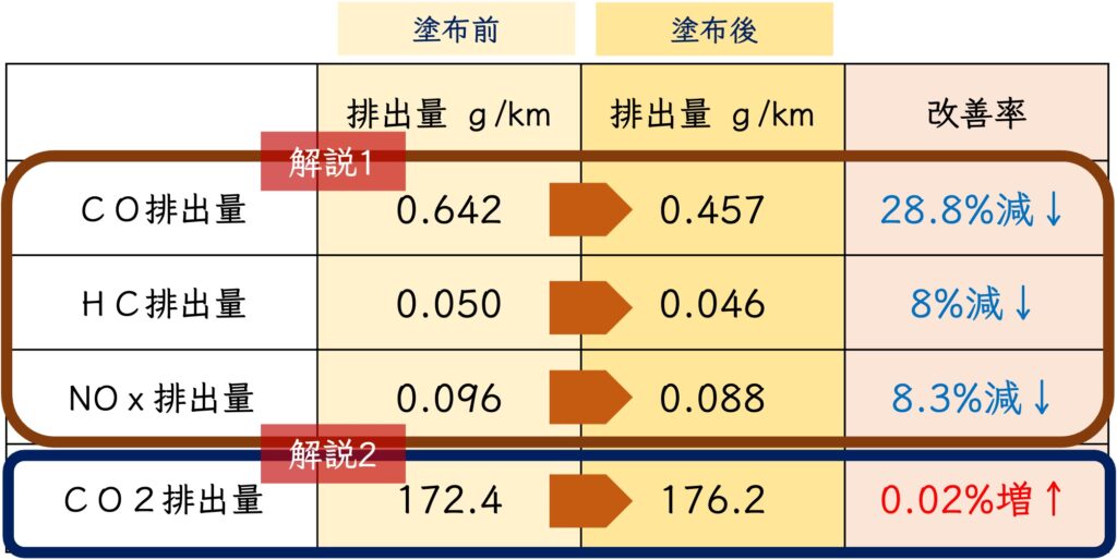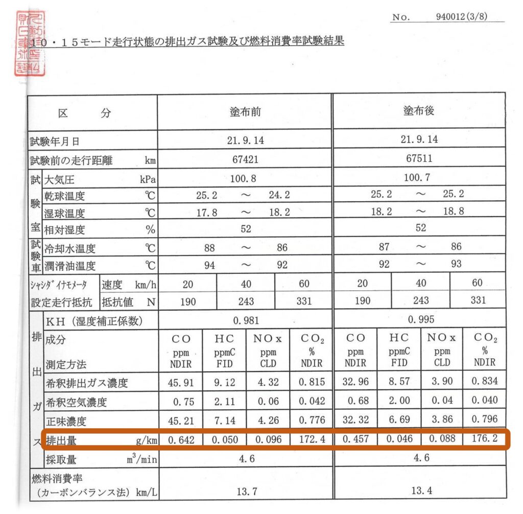 上記表の場合はその後ECU(エンジンコントロールユニット)の学習が進むと「響」の効果により同じパワーを出すのに必要な燃料の量を減らせられるので相対的にCO2も減少します。