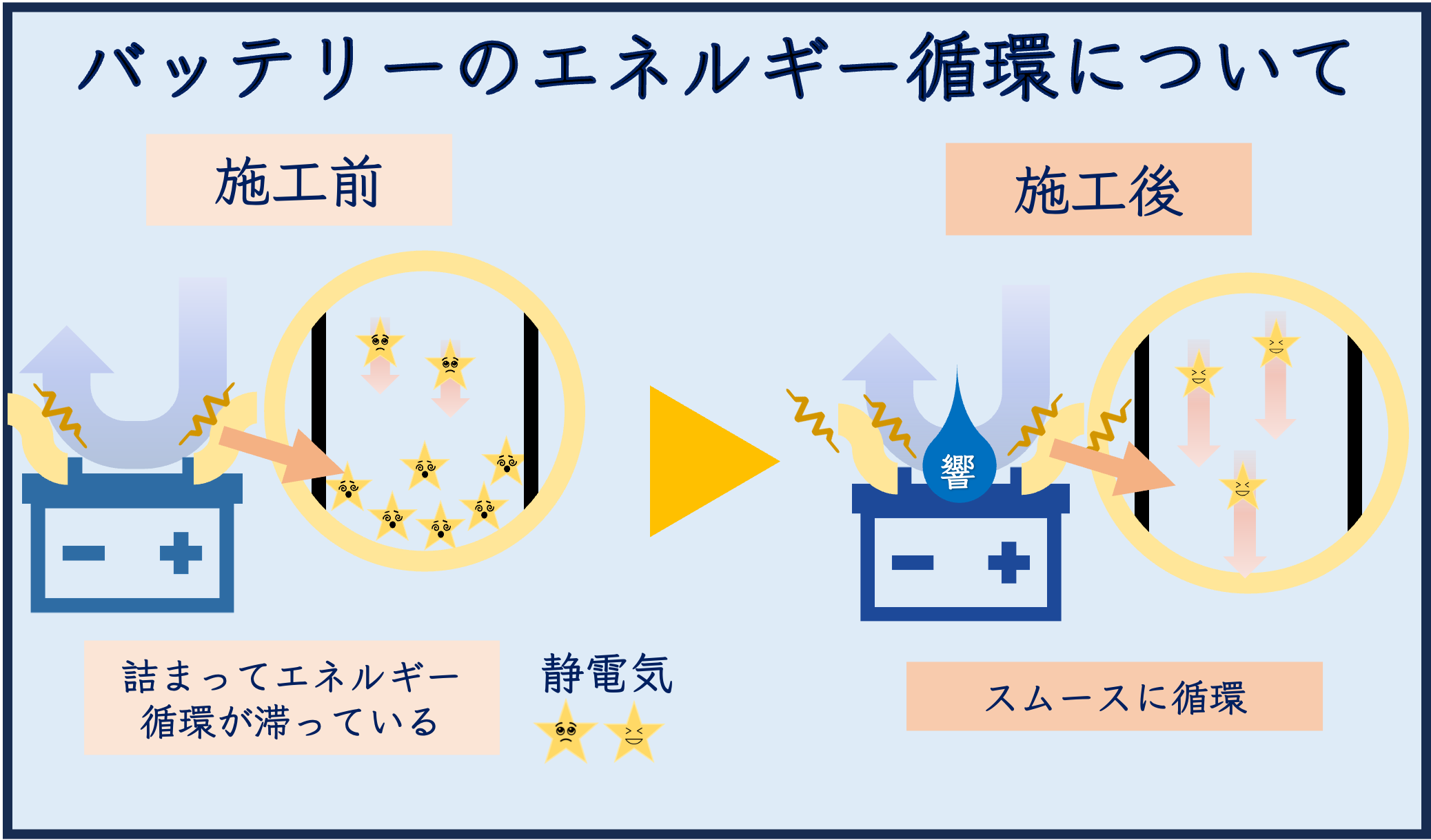 - プラス端子とマイナス端子の間を通電を避ける為に「響」(液体)で繫がらないようにしてください。