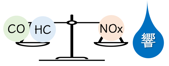 つまり通常状態での燃焼ではCO・HC・Noxを同時に減少させる事は出来ませんが、「響」を使用すると可能になります。
