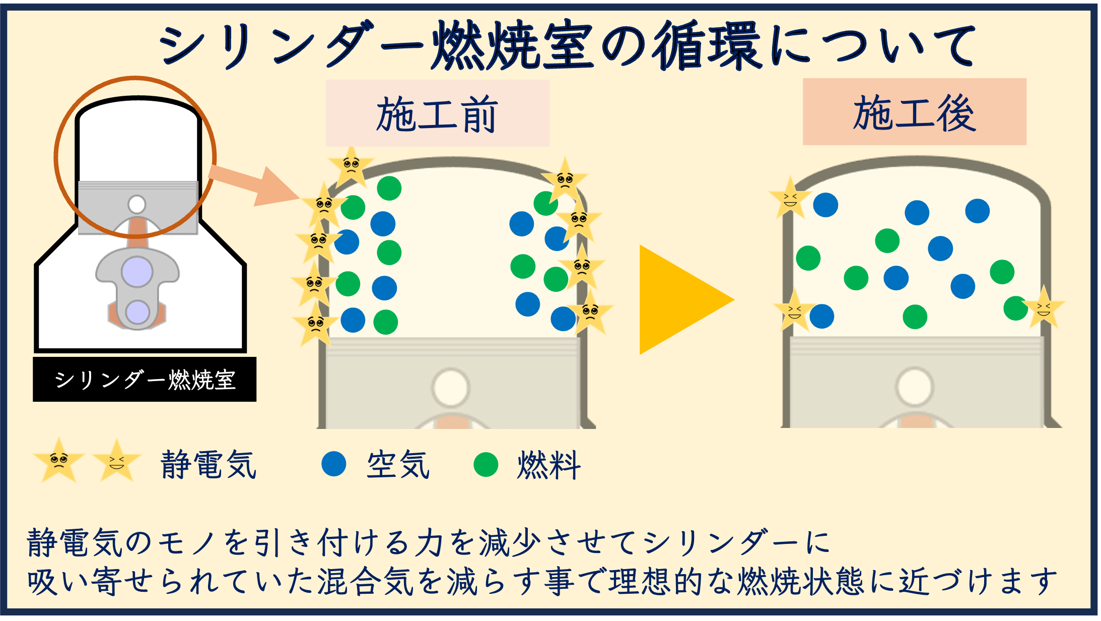 車体全体の静電気を効率良くバッテリーに戻して帯電量を減らす事でシリンダー(燃焼室)内壁に吸い寄せられて燃焼に対して理想の密度では無くなっていた燃料と空気を減らして、理想の燃焼に近づける事で燃焼効率を改善します。